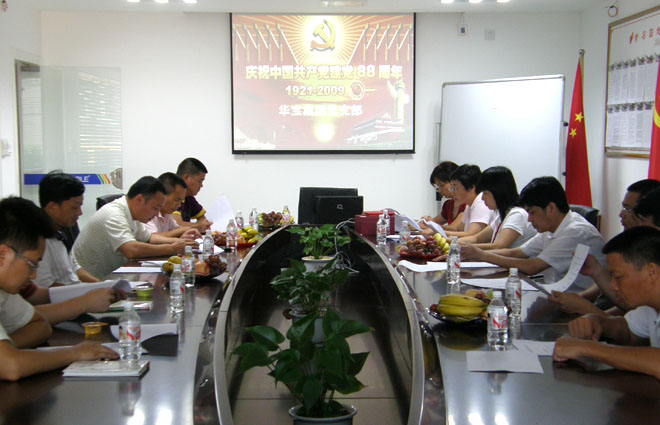 為慶祝中國共產黨成立八十八周年,我集團黨支部召開了“七·一”黨員大會。 集團黨支部書記吳立新對支部的發展歷程、支部的工作及黨員的發展情況做了介紹,開展學習黨支部三會一課及胡錦濤總書記的“科學發展觀”。 大會上,支部委員會授予:曾君海(化工廠)、陳國華(二廠)同志2008—2009年度“優秀共產黨員”稱號! 華寶黨支部全體黨員參加會議 集團黨支部書記吳立新發表講話 |
